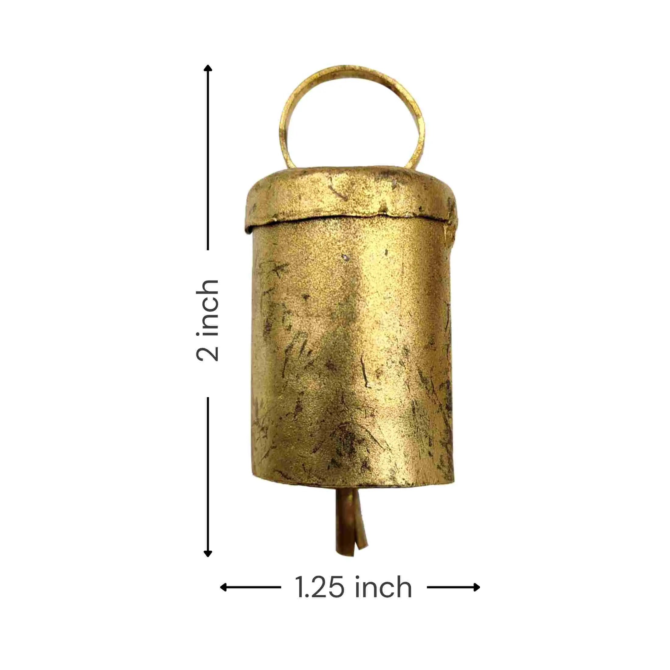 Set of 10 golden rustic cow bells, available in 1.5 inch and 2 inch sizes each approx, handcrafted from durable tin metal with an antique gold finish. Lightweight bells with a soft tinkling sound, ideal for DIY crafts, wind chimes, door hangings, wedding decor, festival decorations, boho and vintage home decor projects.