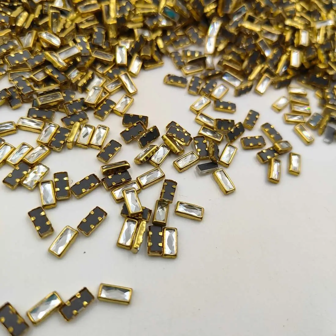 High-shine rectangle kundan stones made from premium durable glass with an elegant gold base finish. Smooth edges and a reflective silver surface make them ideal for bangle crafting, necklace and bracelet making, embroidery, garment designing, DIY crafts, resin art and decorative projects. Available in 8×3mm size, suitable for both professional and handmade creations.