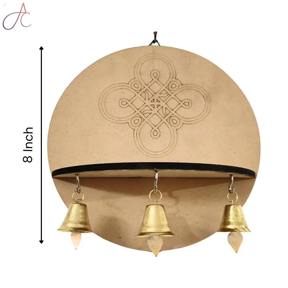 Bring home a blend of spirituality and art with this pre-marked wall mount base featuring an elegant Kolam design. Made from sturdy 6mm MDF and measuring 8 inches, this round wall décor piece includes three golden bells that add a classic, festive touch. Its smooth surface is ideal for painting, decorating, or leaving natural. Perfect for pooja corners, entryways or as a unique gift for special occasions.