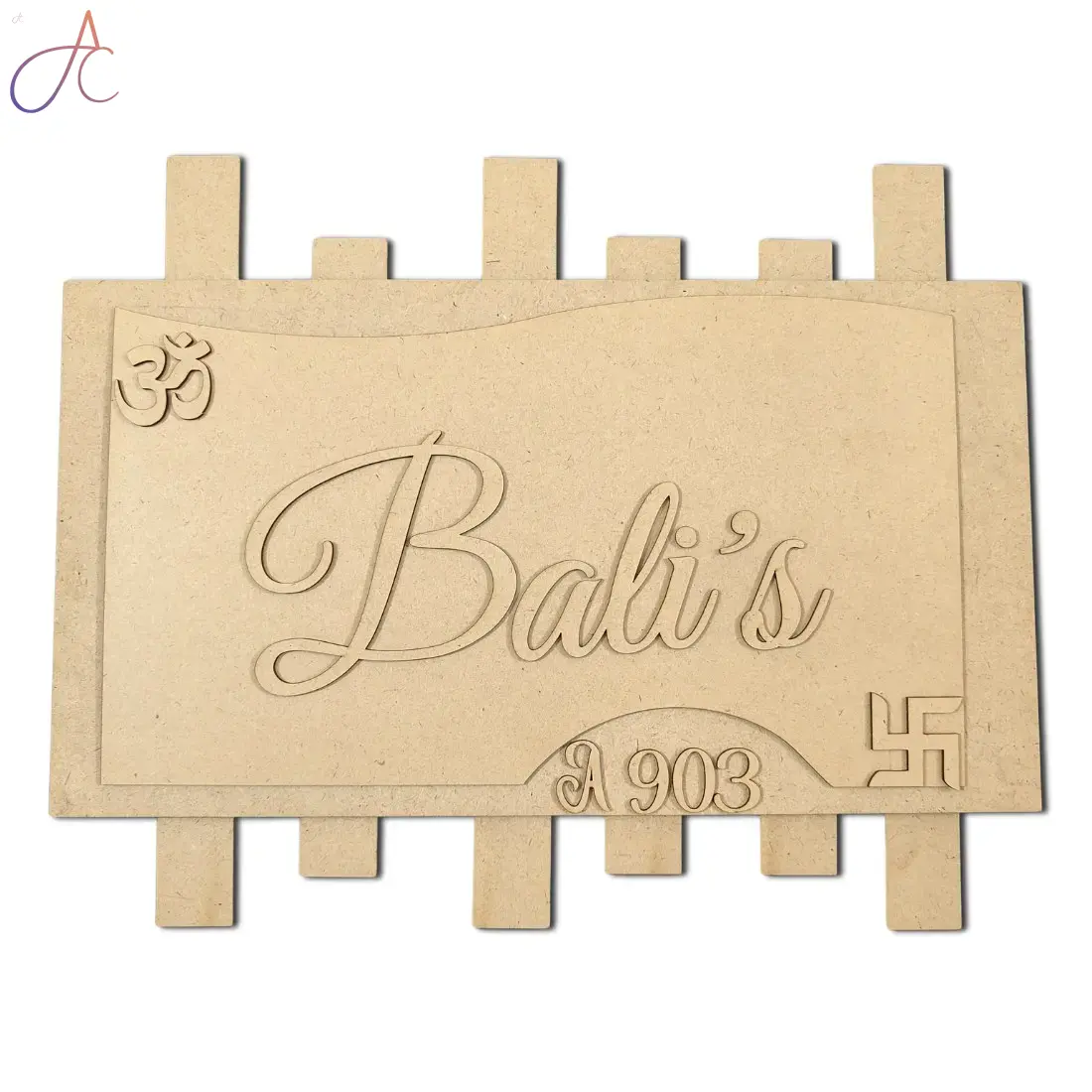 This modern MDF name plate is perfect for apartments or homes. Featuring a stylish engraved design with your custom name and flat number, it adds a minimal yet personalized touch to your entrance. Ready for painting or decorating as per your style.