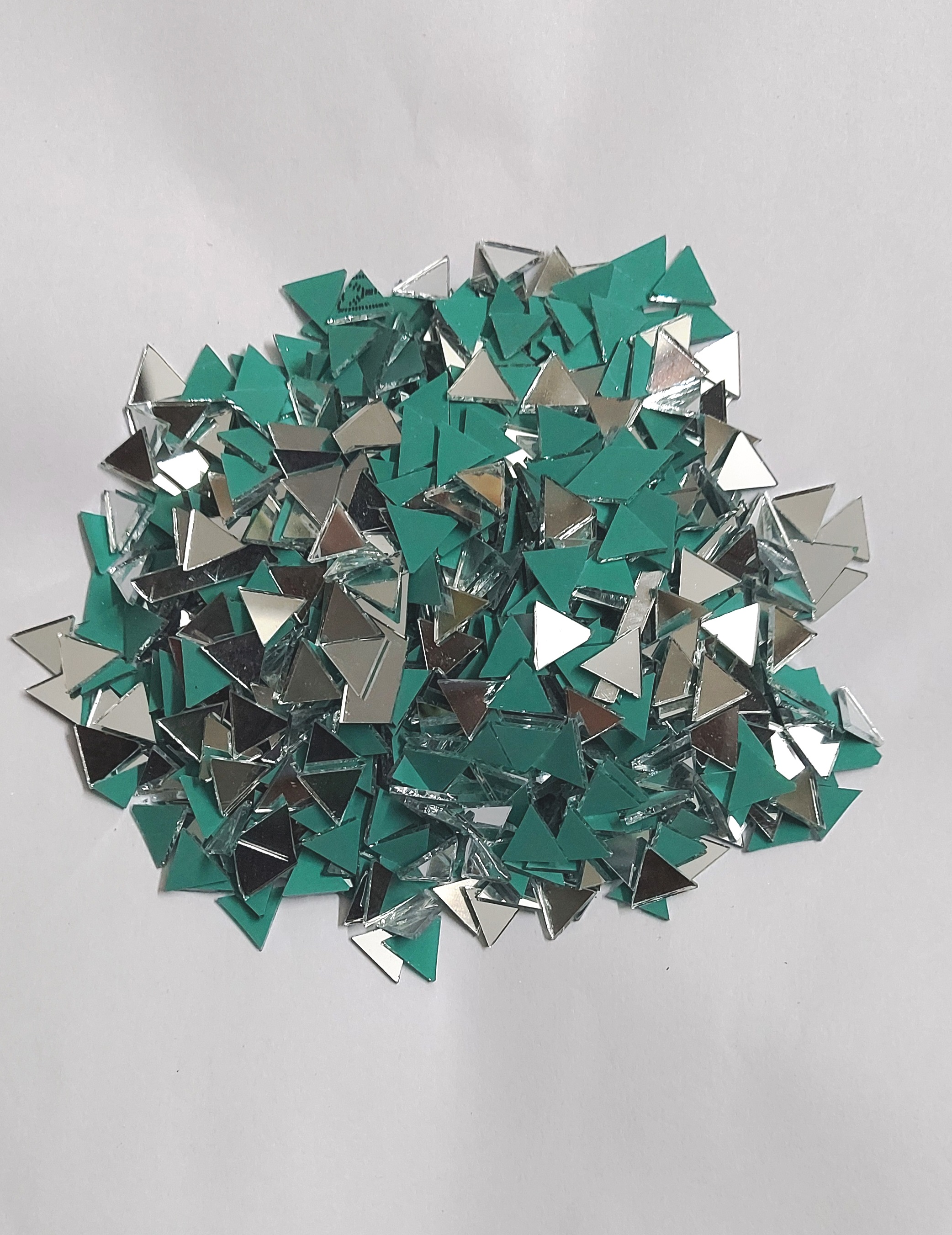 Triangle-shaped glass mirrors in 100g, 500g and 1kg packs. Without holes, suitable for jewellery, Lippan art and all types of craft projects. Easy to stick on any surface.