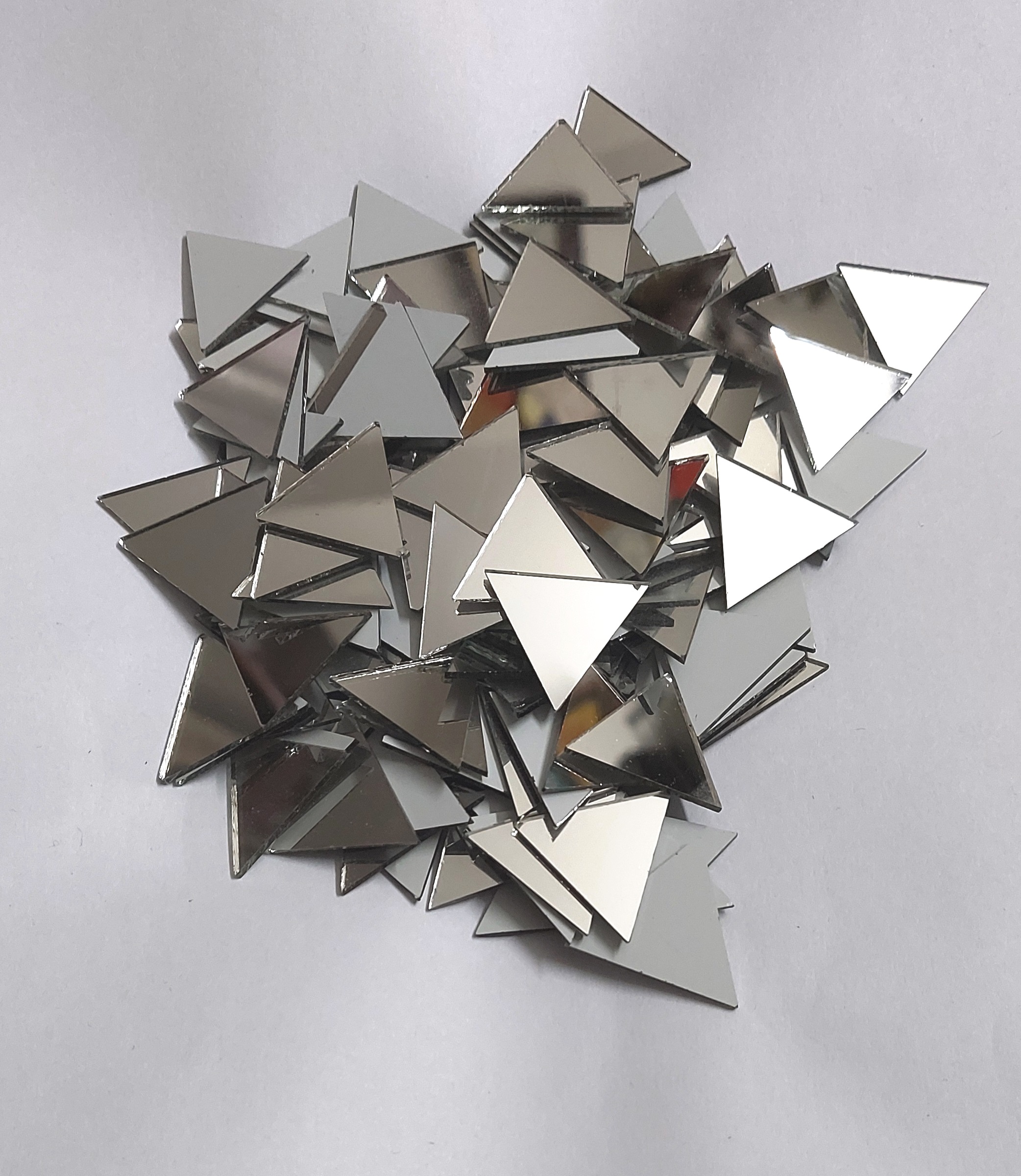 Triangle-shaped glass mirrors in 100g, 500g and 1kg packs. Without holes, suitable for jewellery, Lippan art and all types of craft projects. Easy to stick on any surface.